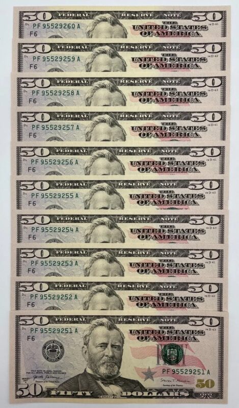A stack of $50 bills contains 100 notes each and is wrapped with a special paper band.